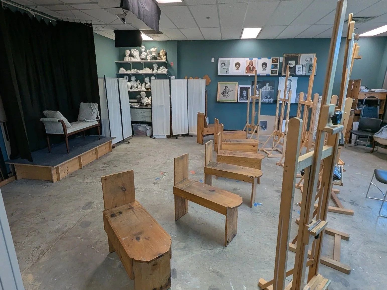 Our studio is designed for an optimal drawing experience, with ample lighting and space. Because the room isn’t enormous, we use a booking system to manage front-row (seated) and back-row (standing) positions. Front-row seats allow seated work with an unobstructed view, while easels in the back row are ideal for standing students. Note: it may be challenging to work seated at a back-row easel due to limited sightlines.