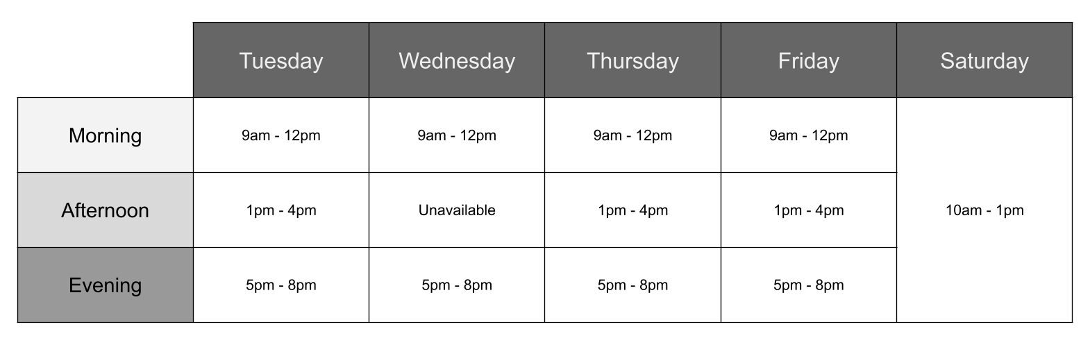 To book a time slot, students typically communicate with the academy directly. They can choose a time that suits their availability from the available slots. Once a time slot is booked, it becomes reserved for that student on a weekly basis. The schedule is also flexible incase your availability changes. You must then contact the academy and arrange for a new time slot. For missed or lost classes, please visit our Policy page for more info.